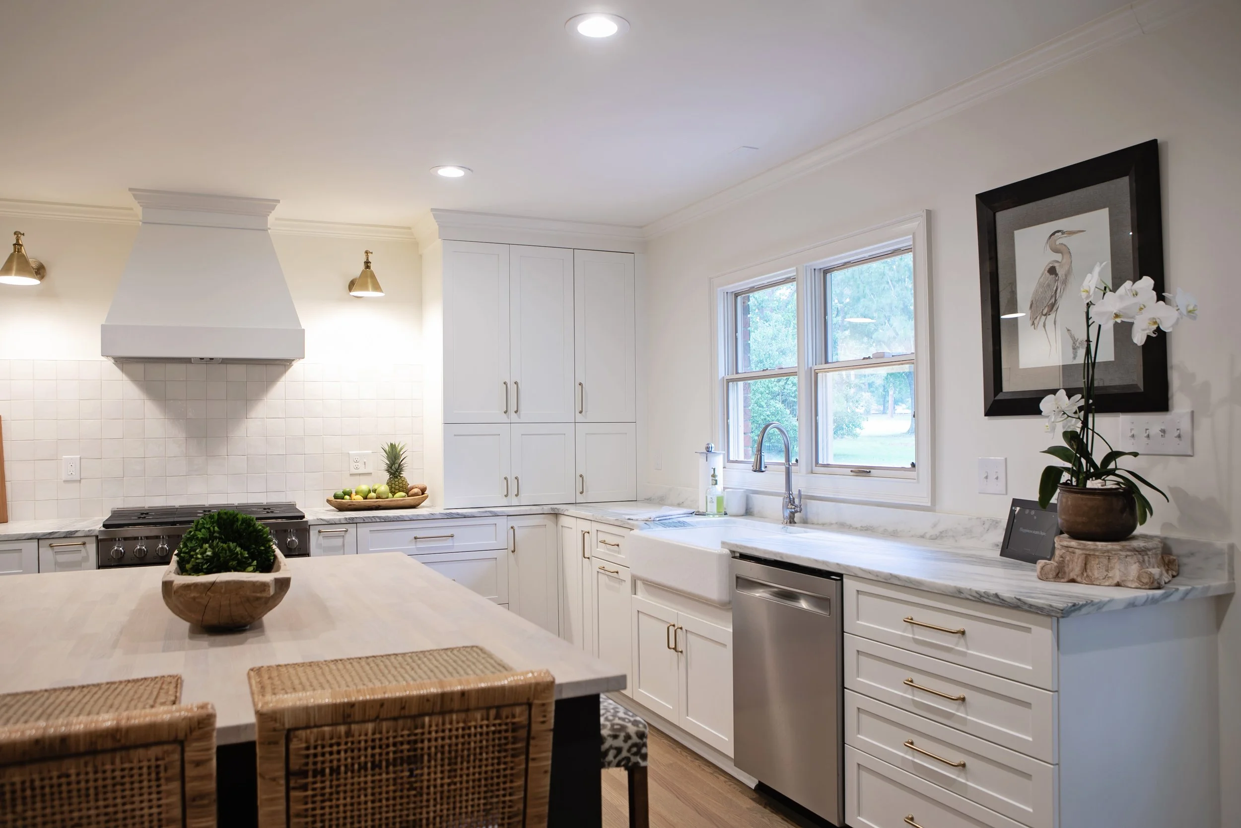 Two identical wall sconce lighting fixtures were installed on either side of the new vent hood to illuminate the beautiful backsplash and to provide greater visibility for cooking and food prep activities.