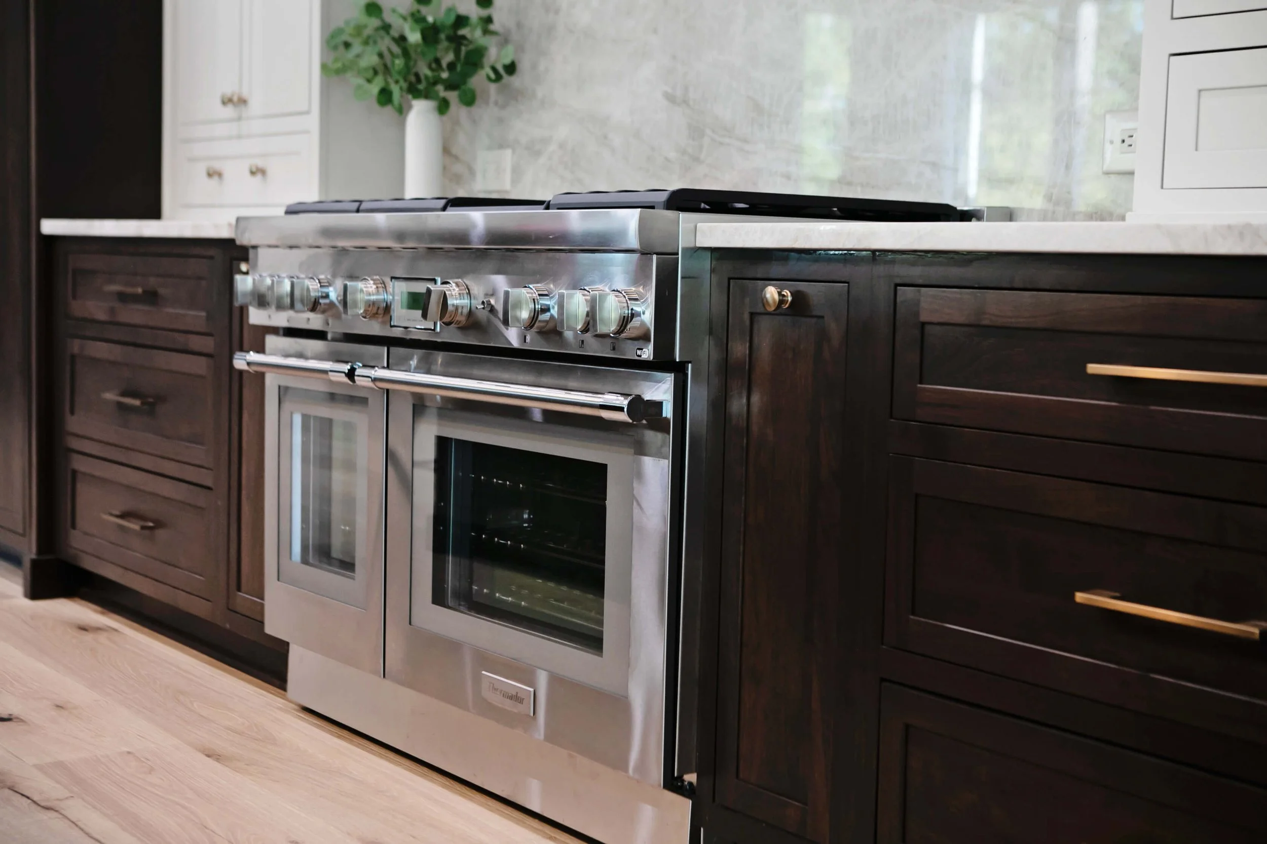 The tall perimeter cabinets on the range wall and base cabinets are made of walnut and finished in a Bison stain, anchoring the kitchen with warmth and natural texture.