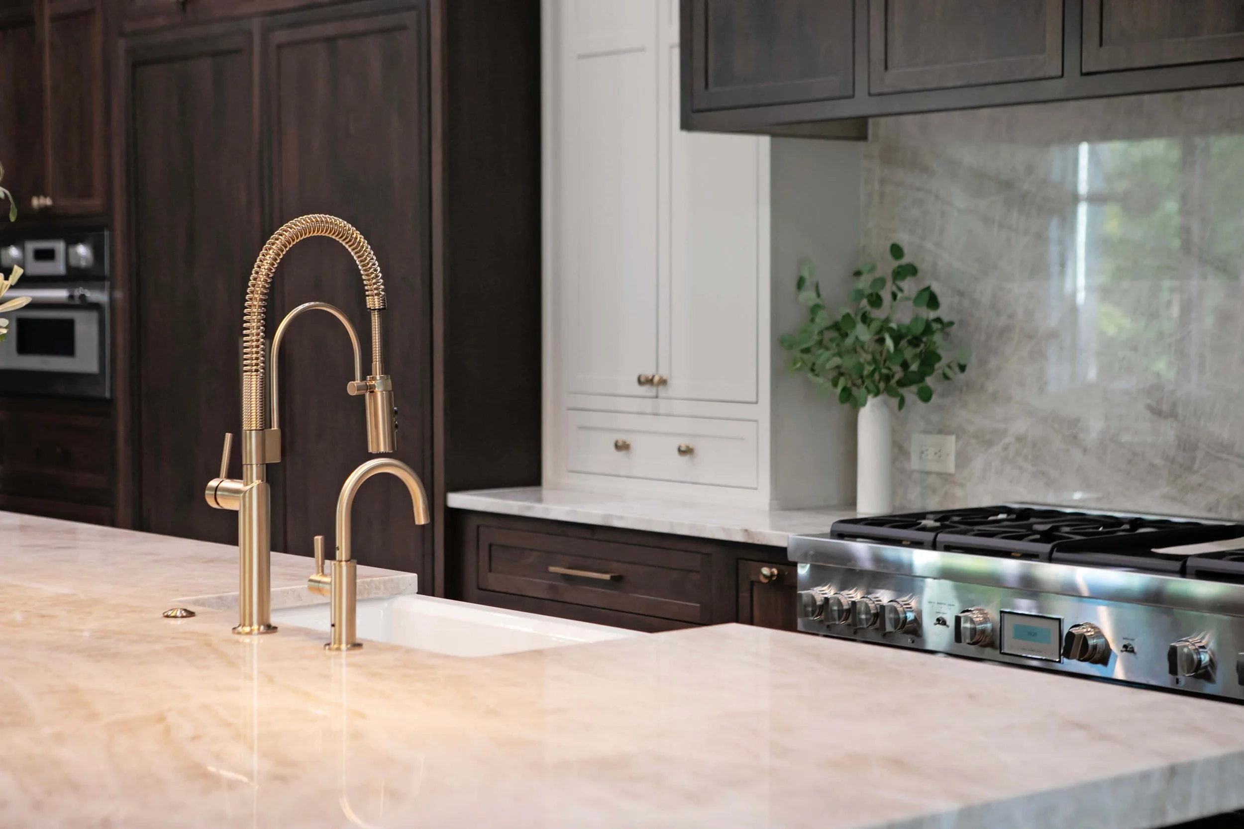 A walnut kitchen island in Bison stain mirrors the range wall cabinetry and serves as the focal point of the space.